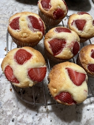 HM一袋150グラムに、卵一個、牛乳60ml、アボオイル60ml、お砂糖の代わりに白チョコチップを混ぜてイチゴを乗せて焼いただけ。