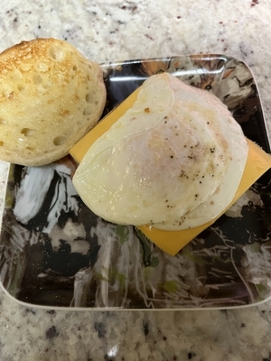 がぶり、とかぶりついたら、半熟以下であった黄身が全部流れ落ちてしまいました。パンですくって食べたけど、ちょっと残念。もうちょっと固まらせたほうがいいわね。
